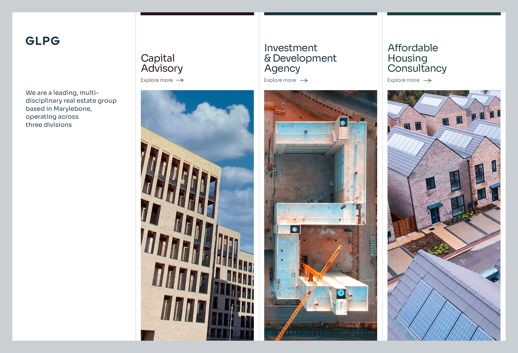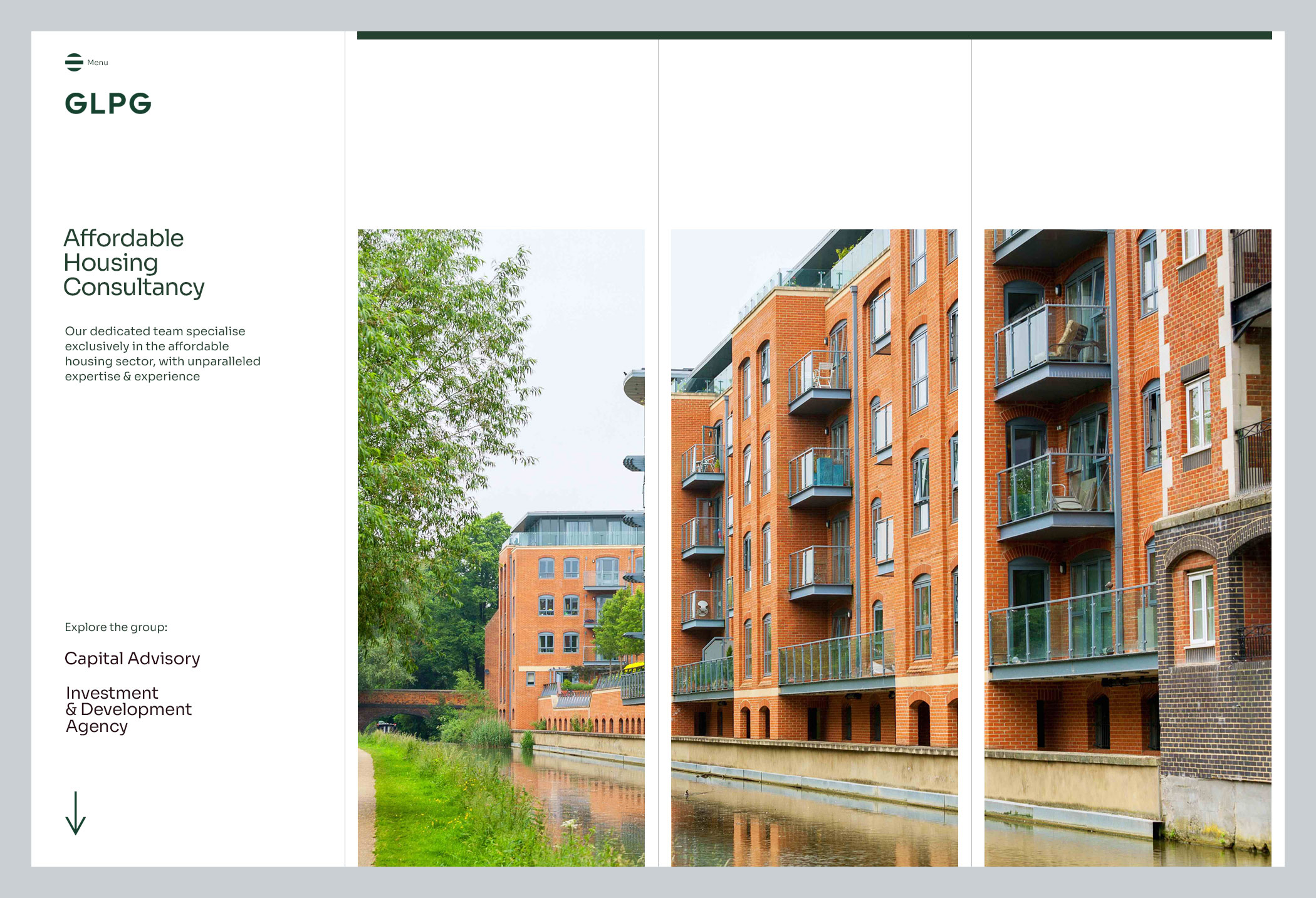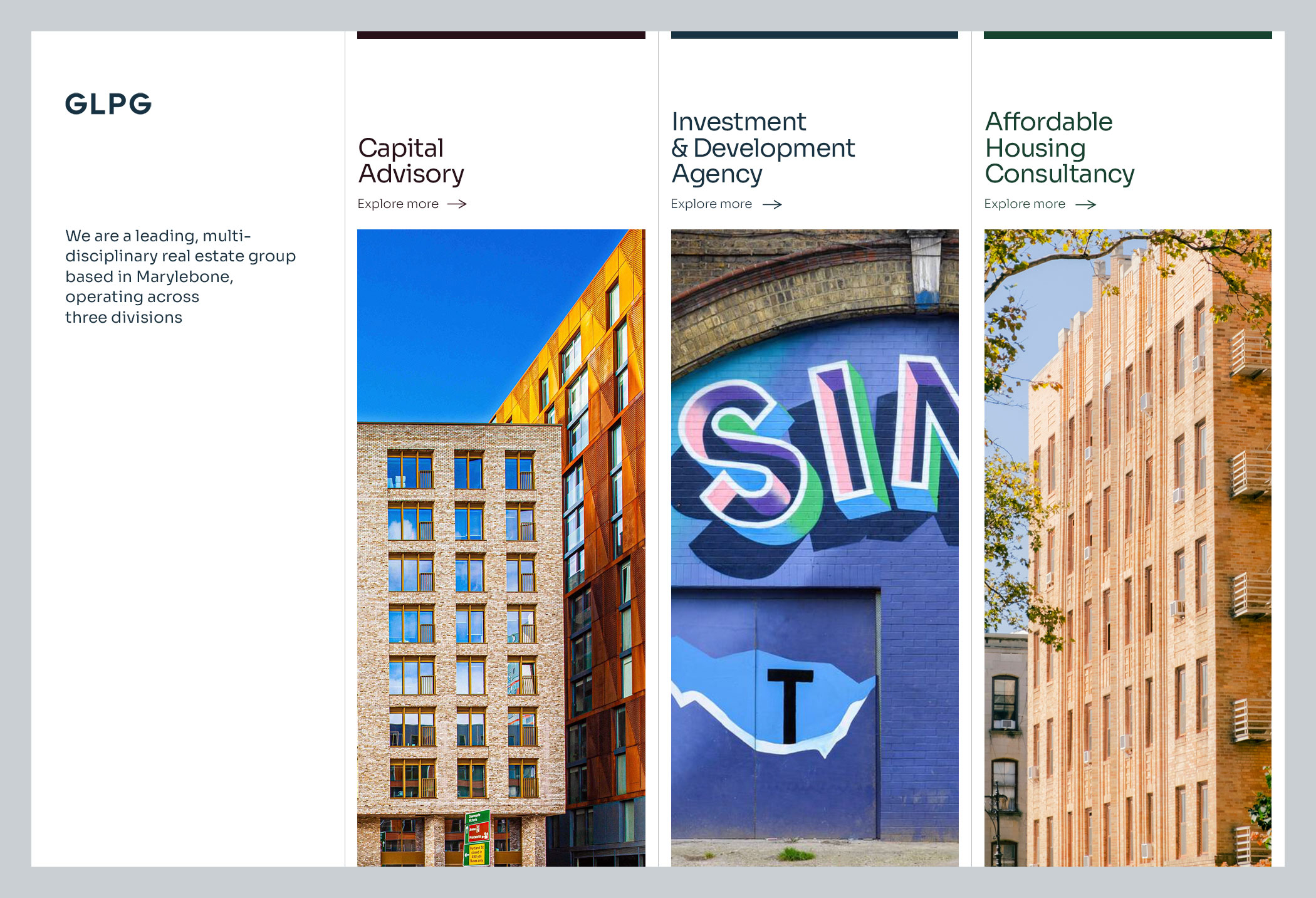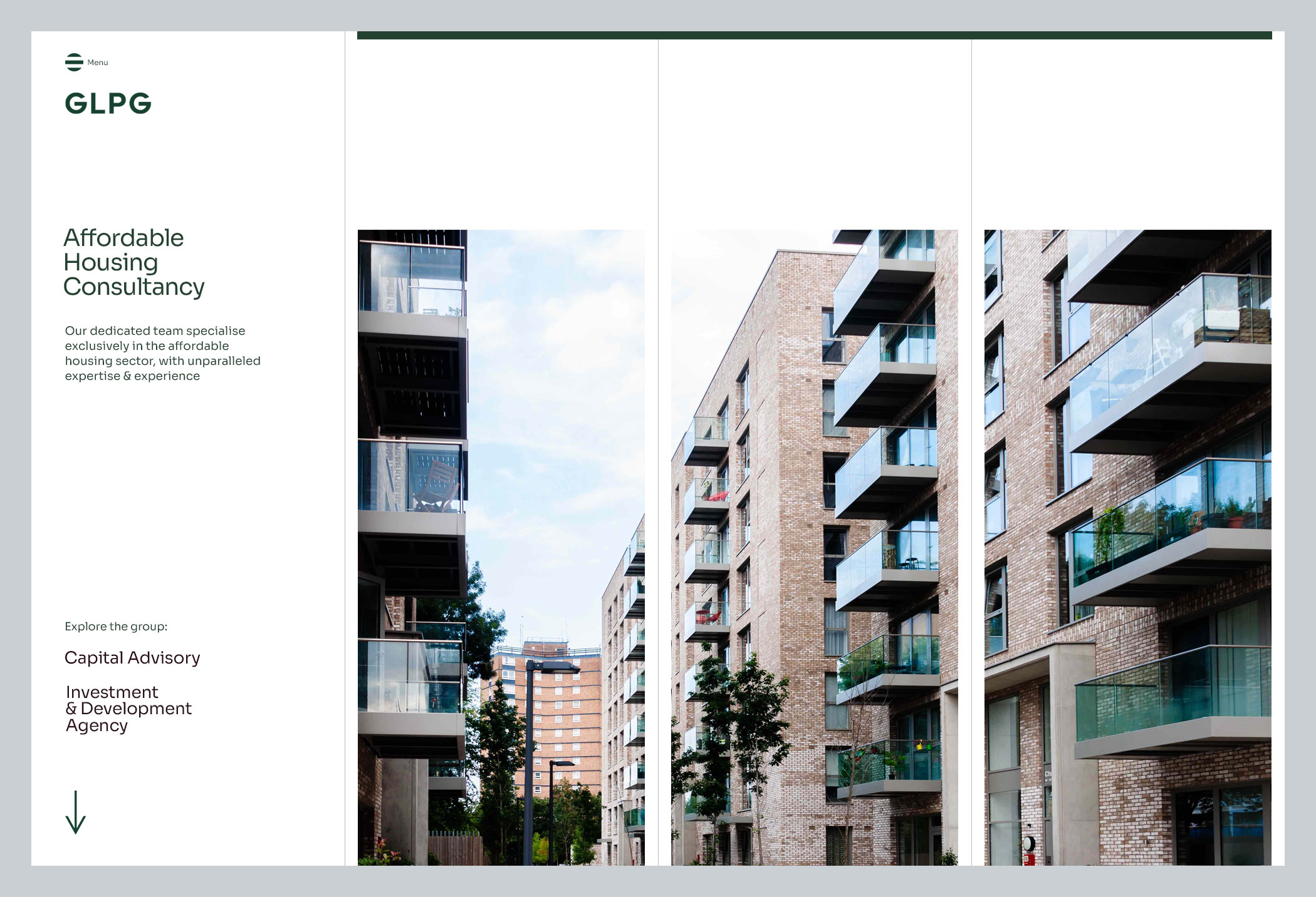 Reimagining their logotype and colour palette set the tone for the visuals and we were able to create alignment on how the site should look and feel. But this wasn’t just about aesthetics. GLPG is split into three key divisions – Capital Advisory, Investment & Development Agency and Affordable Housing Consultancy – this applied to our website and added an extra level of scope regarding the navigation and functionality.