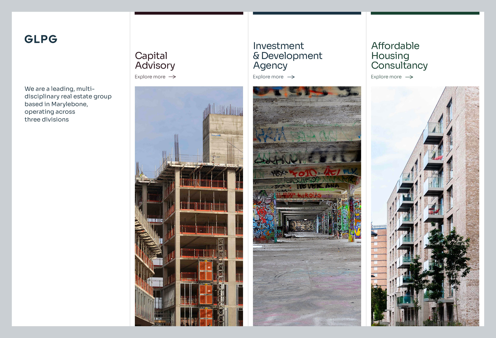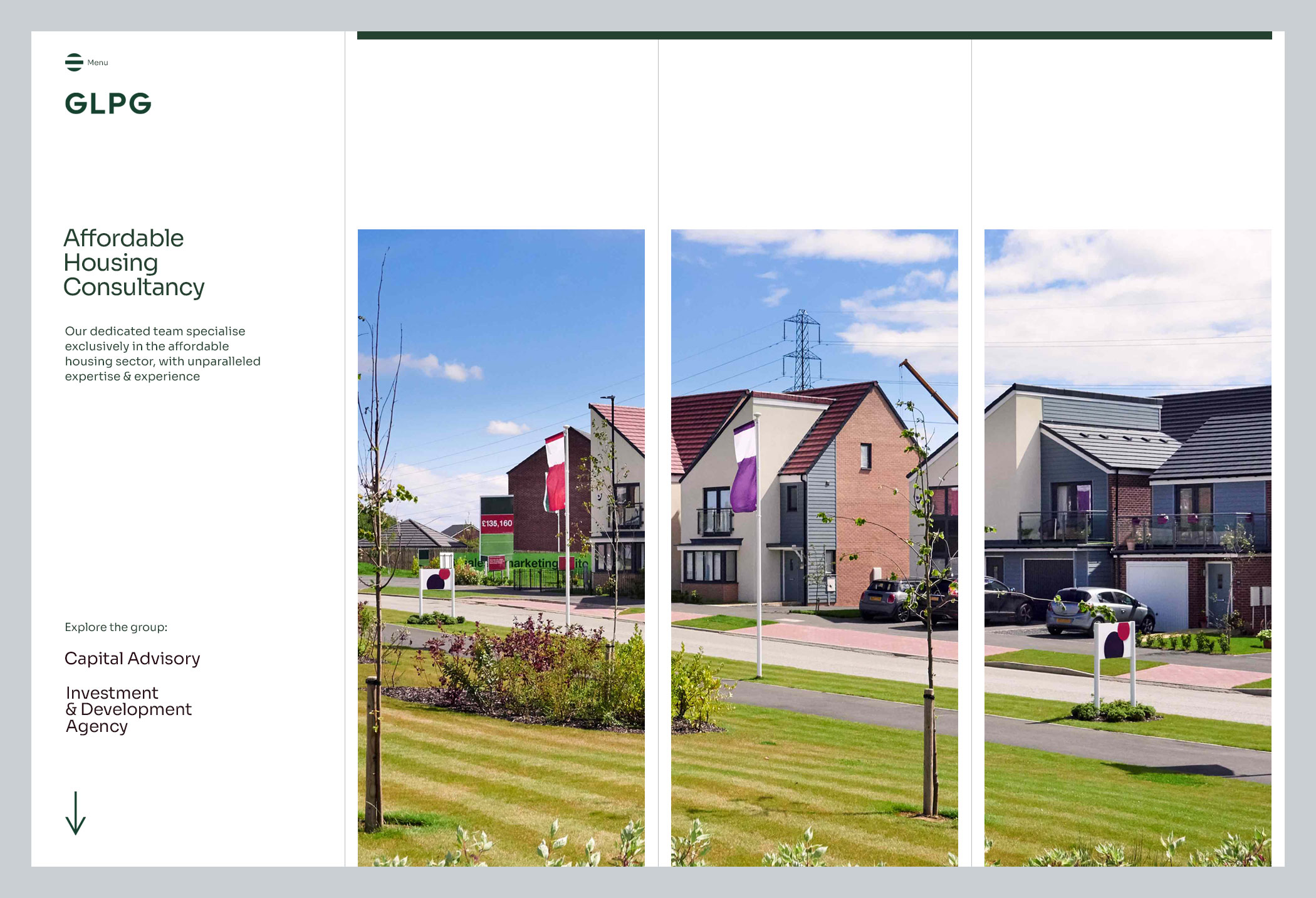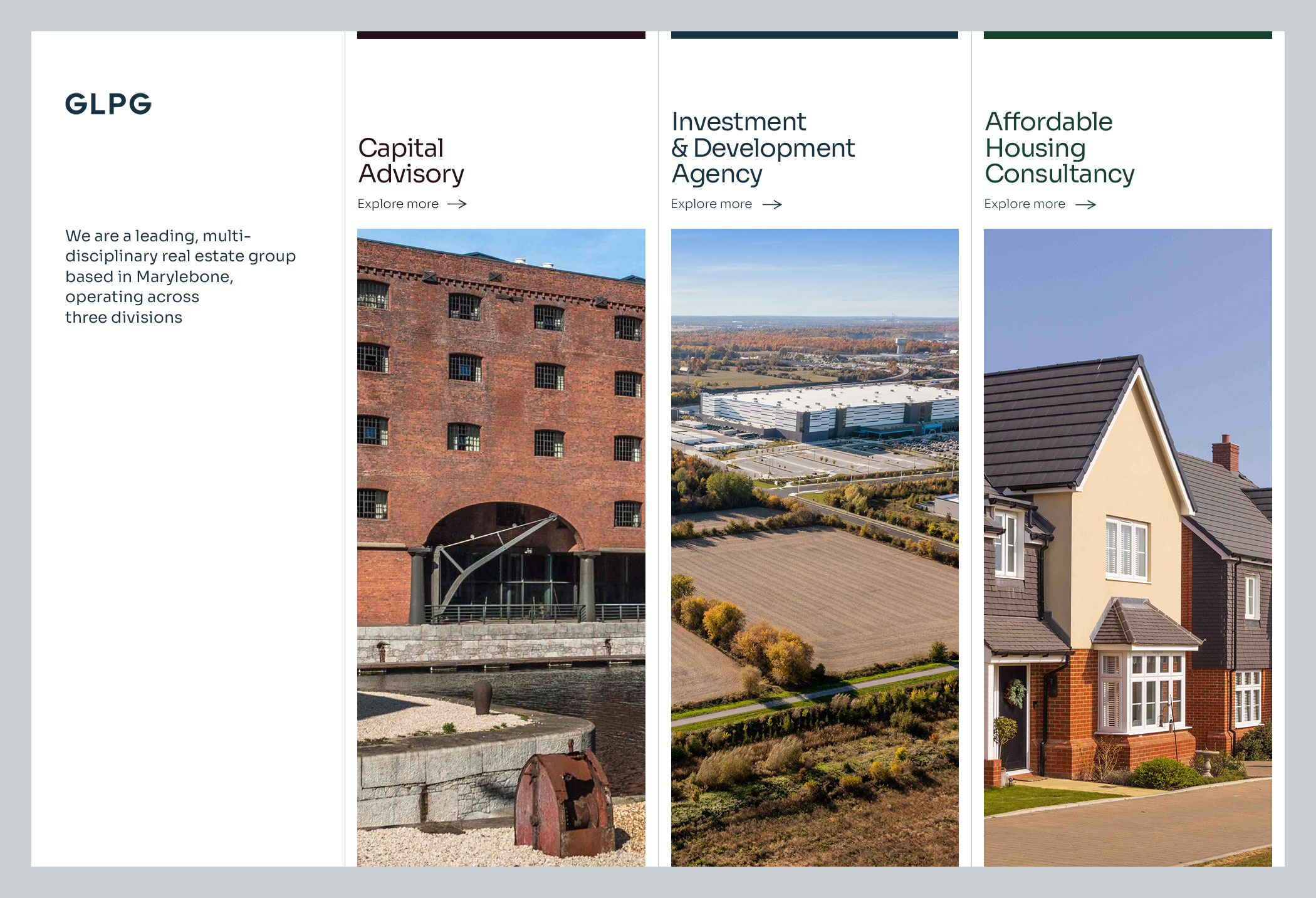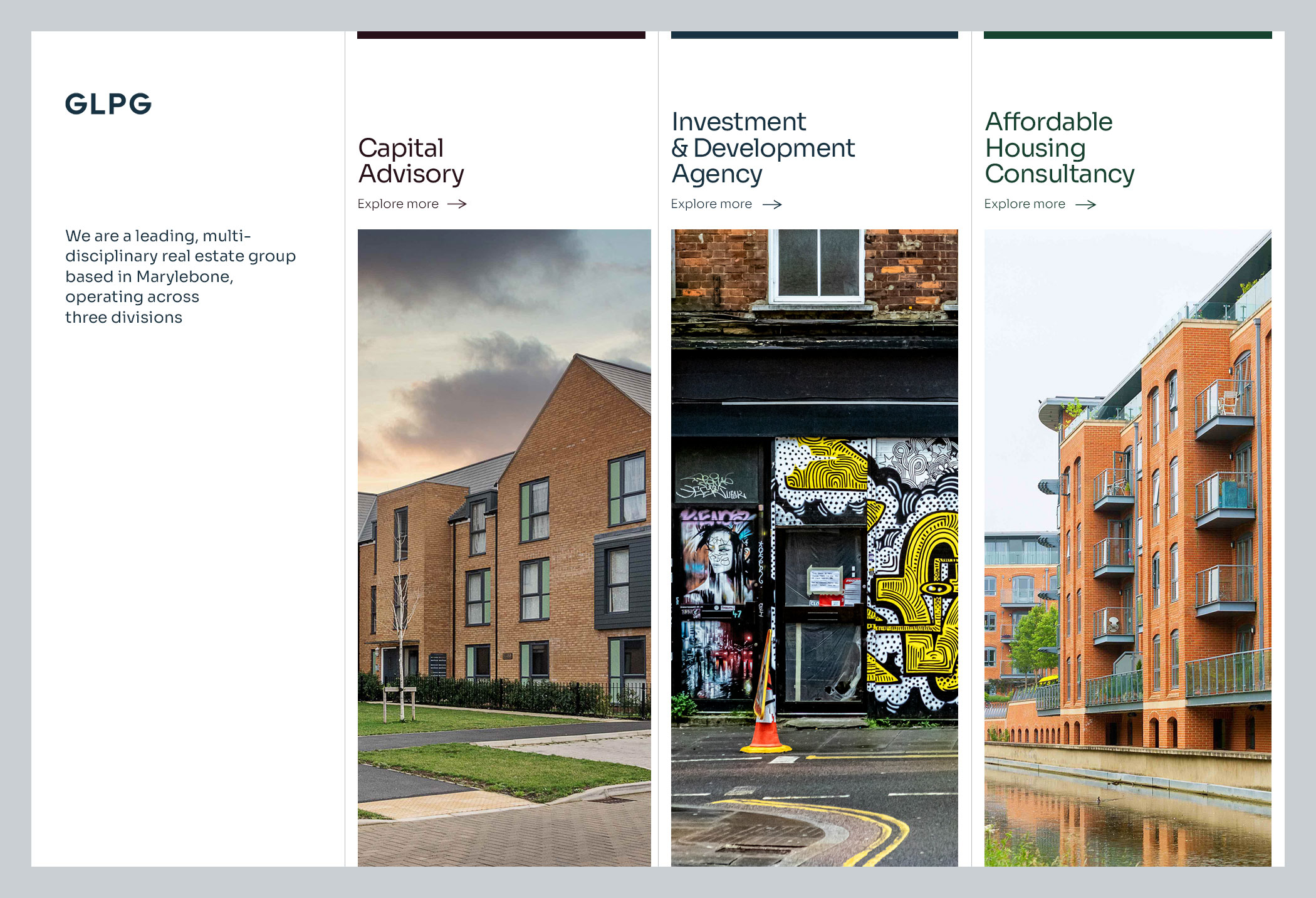Reimagining their logotype and colour palette set the tone for the visuals and we were able to create alignment on how the site should look and feel. But this wasn’t just about aesthetics. GLPG is split into three key divisions – Capital Advisory, Investment & Development Agency and Affordable Housing Consultancy – this applied to our website and added an extra level of scope regarding the navigation and functionality.