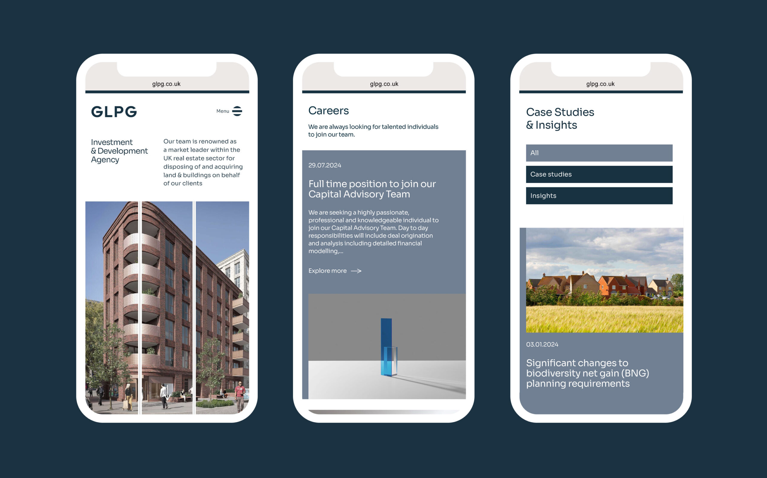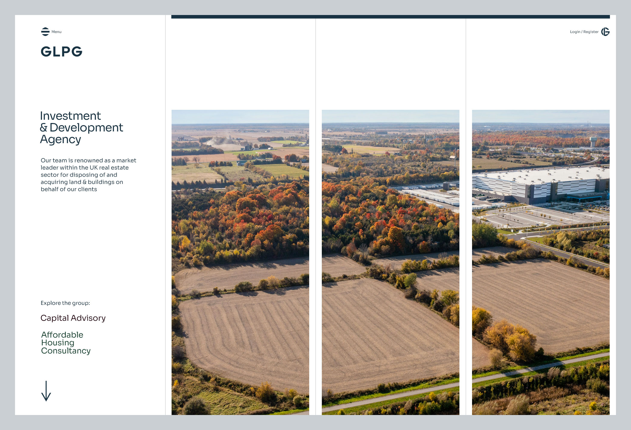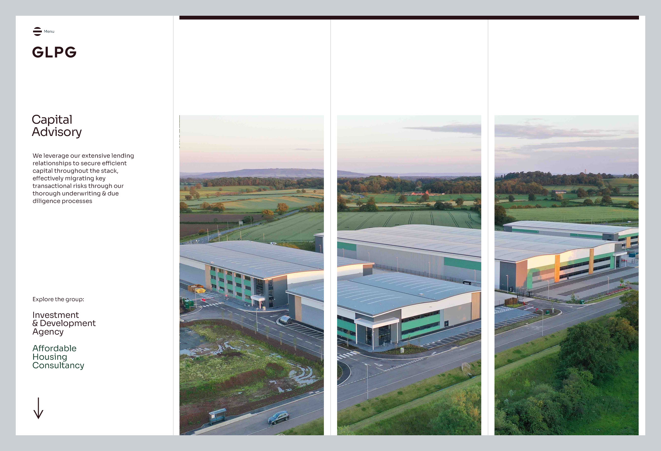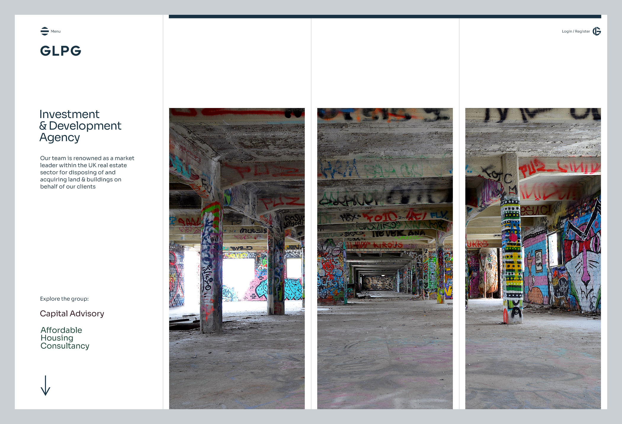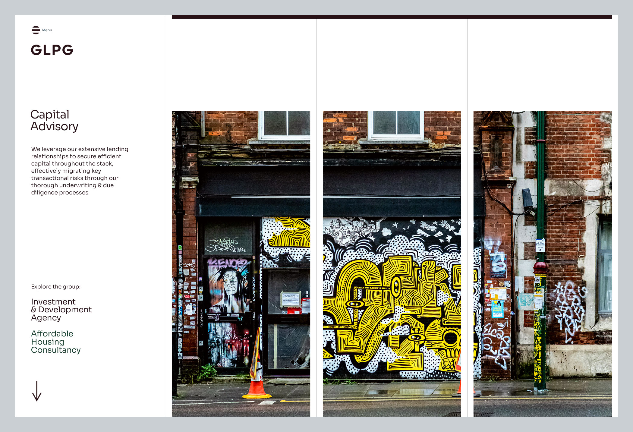 Reimagining their logotype and colour palette set the tone for the visuals and we were able to create alignment on how the site should look and feel. But this wasn’t just about aesthetics. GLPG is split into three key divisions – Capital Advisory, Investment & Development Agency and Affordable Housing Consultancy – this applied to our website and added an extra level of scope regarding the navigation and functionality.