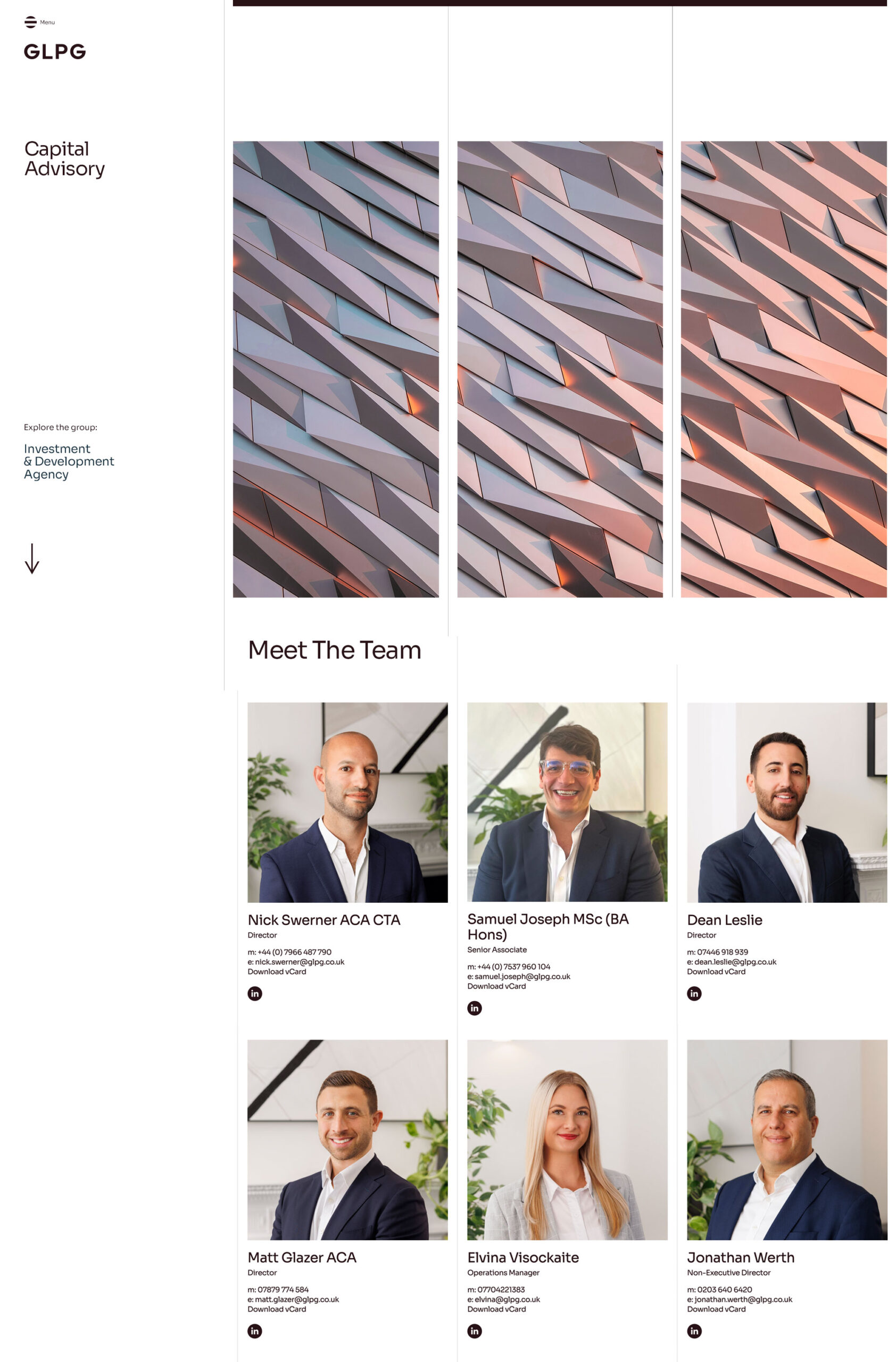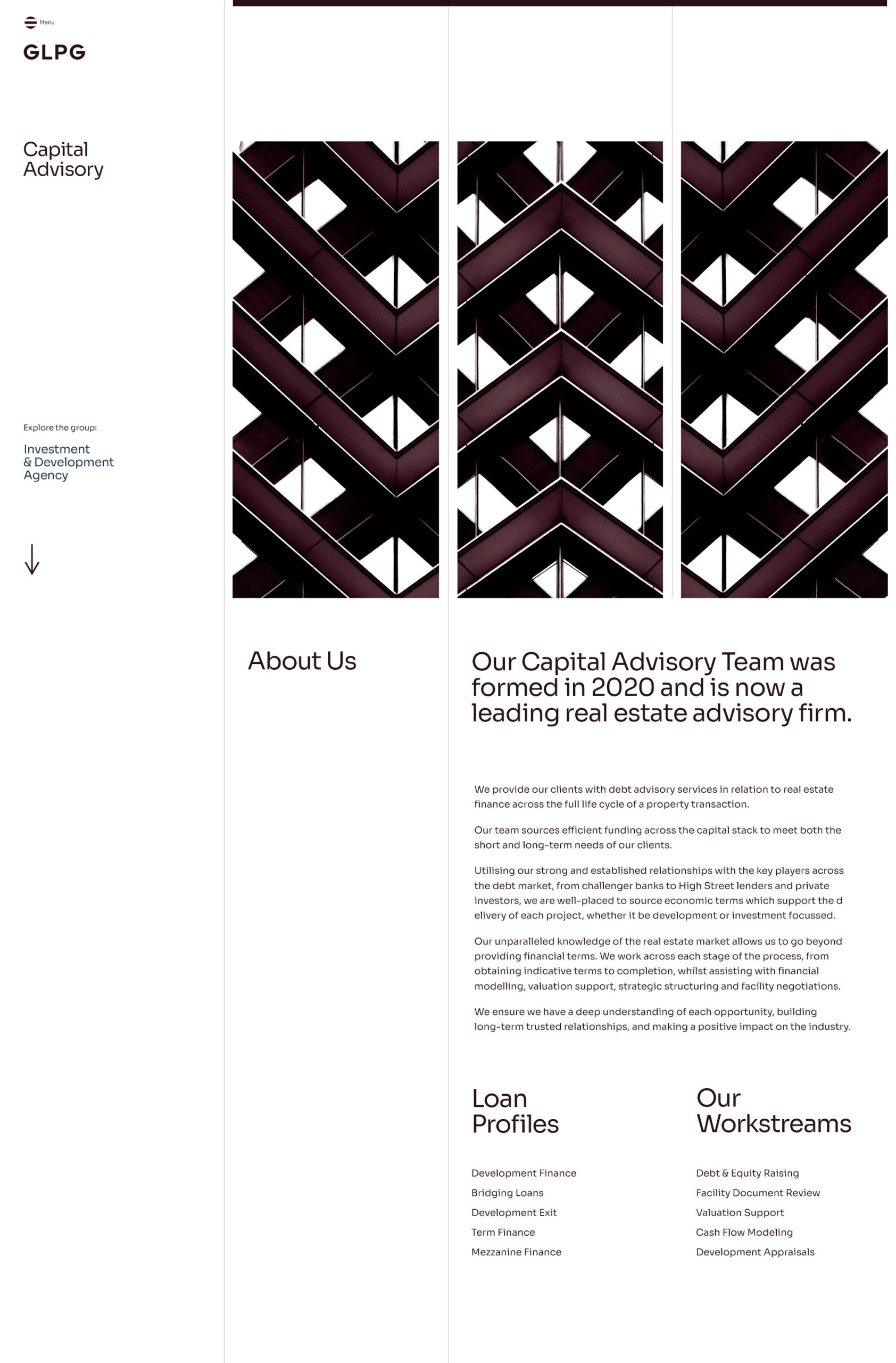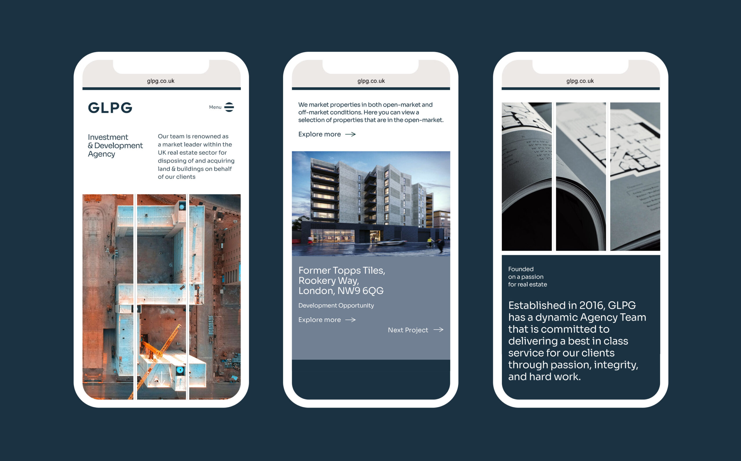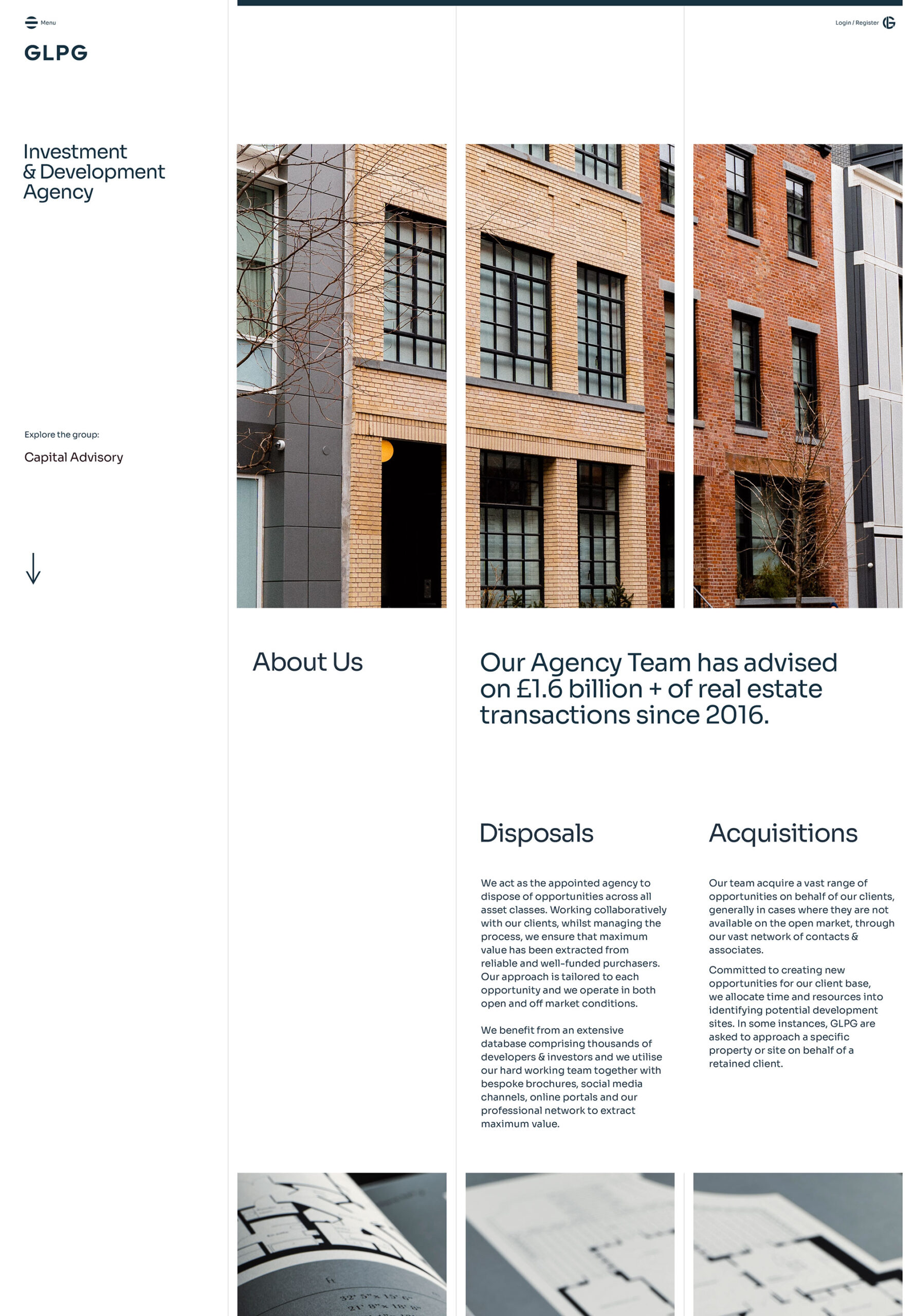 Reimagining their logotype and colour palette set the tone for the visuals and we were able to create alignment on how the site should look and feel. But this wasn’t just about aesthetics. GLPG is split into three key divisions – Capital Advisory, Investment & Development Agency and Affordable Housing Consultancy – this applied to our website and added an extra level of scope regarding the navigation and functionality.