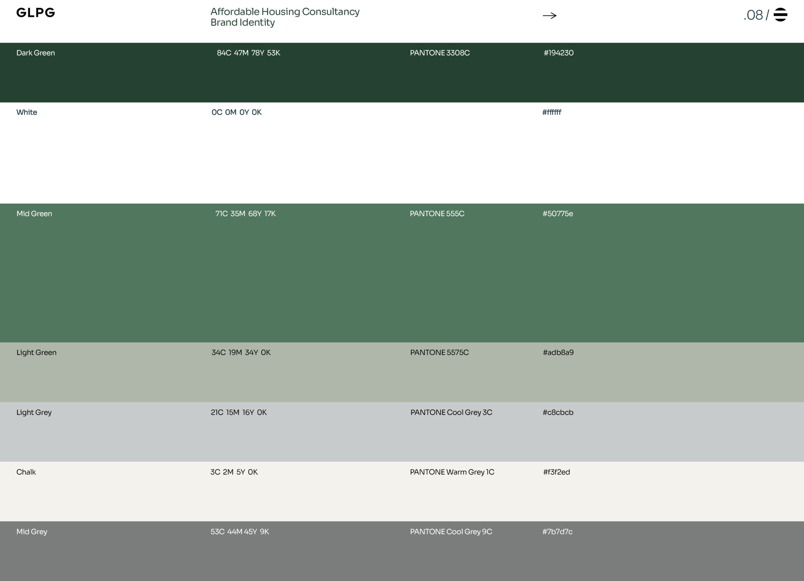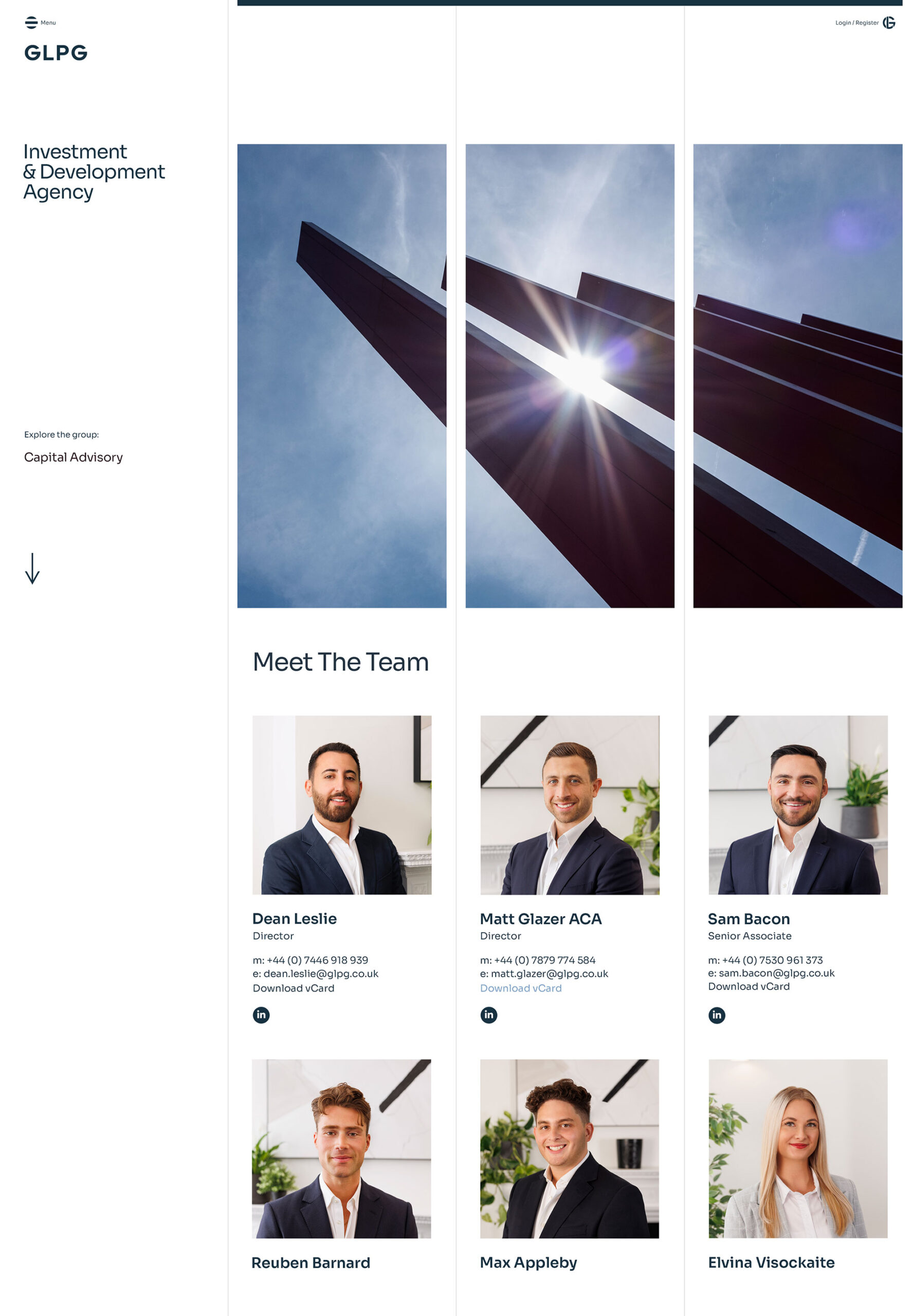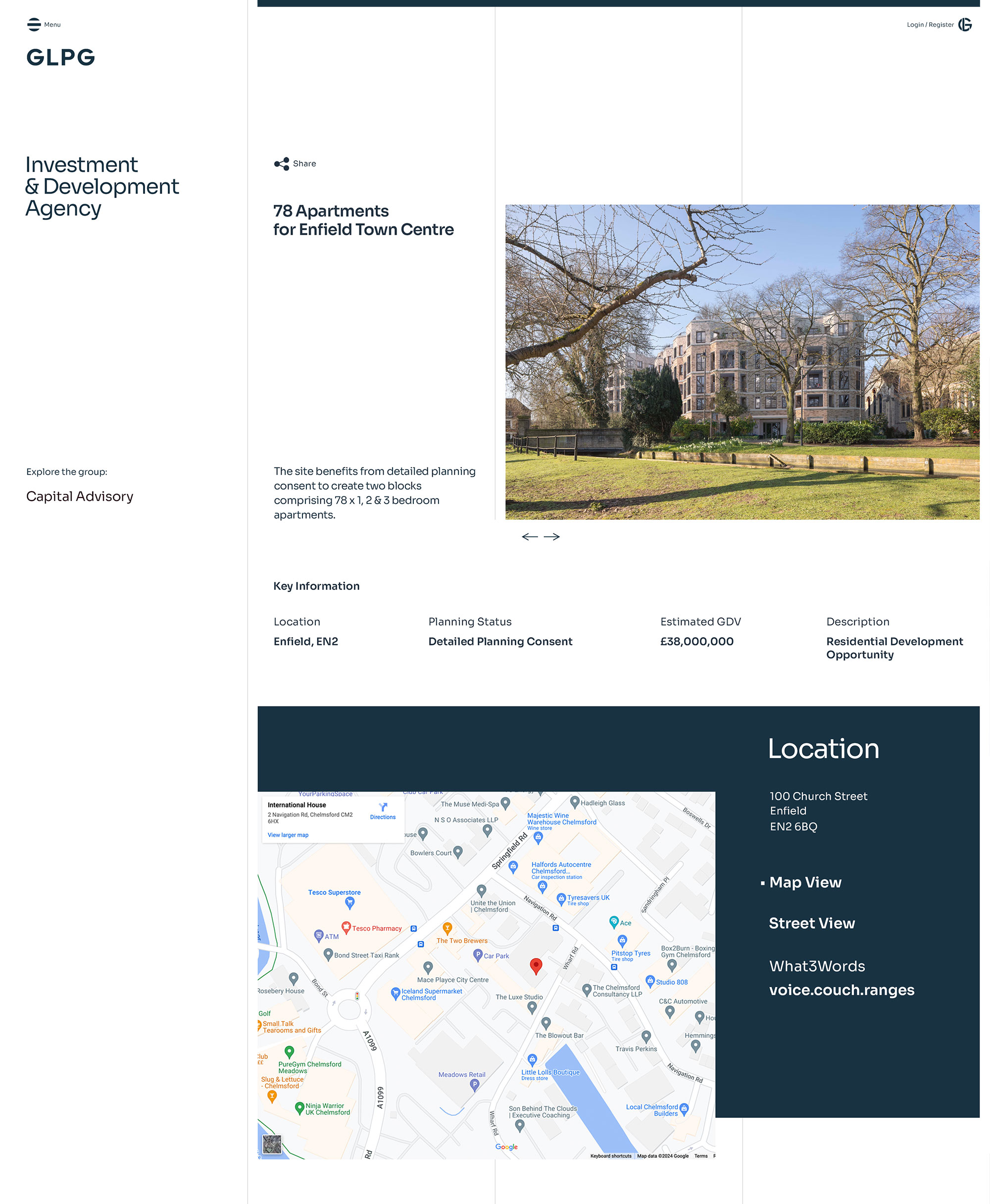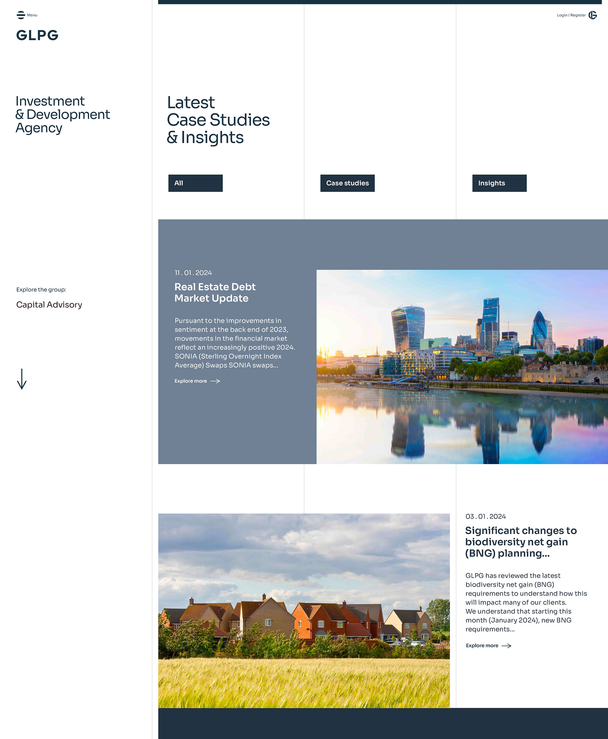 Reimagining their logotype and colour palette set the tone for the visuals and we were able to create alignment on how the site should look and feel. But this wasn’t just about aesthetics. GLPG is split into three key divisions – Capital Advisory, Investment & Development Agency and Affordable Housing Consultancy – this applied to our website and added an extra level of scope regarding the navigation and functionality.